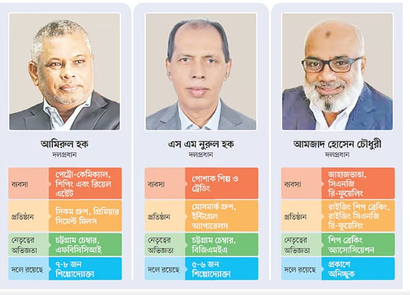 এবারের নির্বাচনে দলনেতা হিসেবে আলোচনায় আছেন চট্টগ্রাম চেম্বার ও দেশের ব্যবসায়ীদের শীর্ষ সংগঠন এফবিসিসিআইয়ের সাবেক পরিচালক আমিরুল হক, বিজিএমইএ ও চট্টগ্রাম চেম্বারের সাবেক সহসভাপতি এস এম নুরুল হক এবং বাংলাদেশ শিপ ব্রেকার্স অ্যান্ড রিসাইক্লার্স অ্যাসোসিয়েশনের (বিএসবিআরএ) সভাপতি আমজাদ হোসাইন চৌধুরী। এর মধ্যে আমিরুল হকের প্যানেলে সদস্যসংখ্যা বেশি। এরপর রয়েছে নুরুল হকের প্যানেল।
